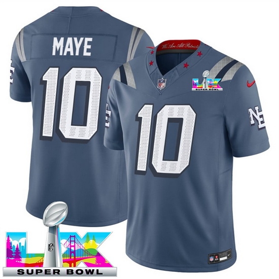 Home>NFL>2025 2026 Super Bowl LX>New England Patriots>Youth New England Patriots 10 Drake Maye Storm Blue 2025 F U S E Super Bowl LX Patch Rivalries Vapor Limited Stitched Football Jersey