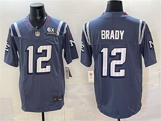 Men New England Patriots 12 Tom Brady Storm Blue 2025 F U S E With 6x Super Bowl Champions Patch Rivalries Vapor Limited Stitched Football Jersey